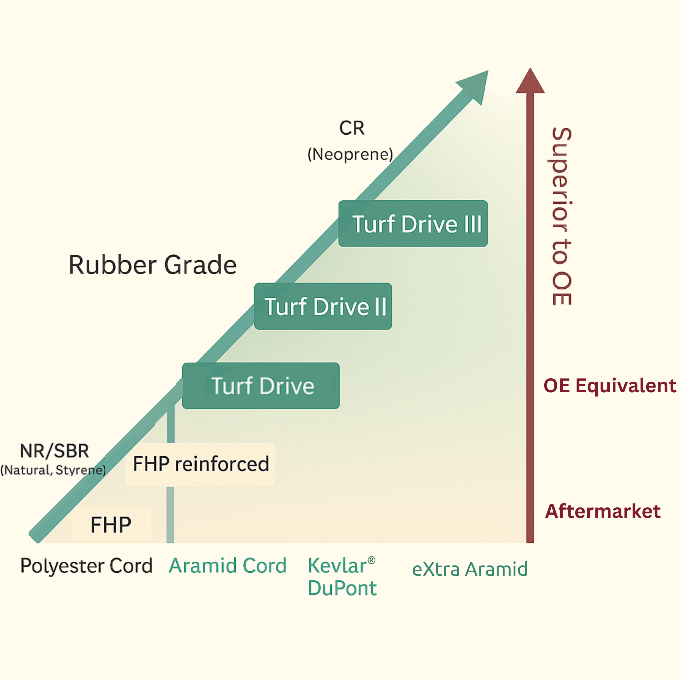 This chart showcases Movendis' advanced core technologies for Lawn & Garden belts, structured by material composition and performance level. From basic FHP belts using NR/SBR rubber and polyester cords, to our high-end Turf Drive III featuring eXtra Aramid cords and CR rubber, each range is engineered to meet specific market needs — from aftermarket to OE and superior-grade applications. Our tiered offering ensures optimal durability, tension stability, and long-term performance across all mowing conditions.